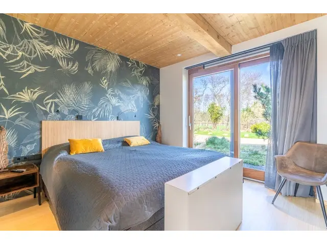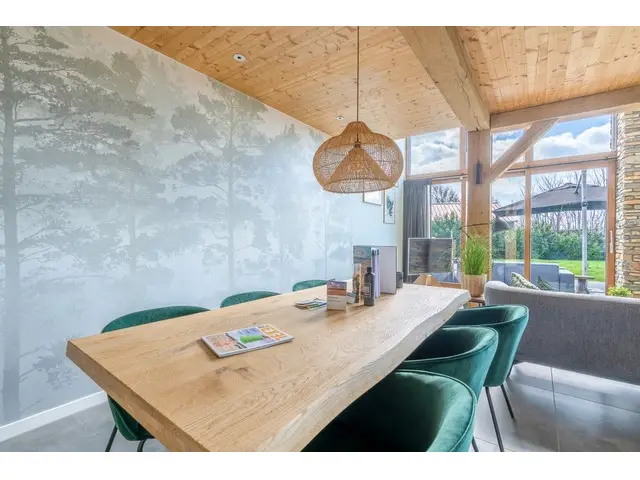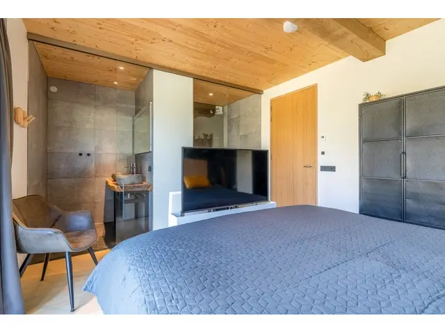 Via de brede openslaande deuren in de woonkamer bereik je het ruime, op het zuiden gelegen terras. Hier vind je comfortabele tuinmeubelen, waaronder een loungeset en twee ligbedden. Ook is er een buitenkeuken met een Big Green Egg en een houtgestookte hottub, ideaal om optimaal te genieten van het buitenleven.